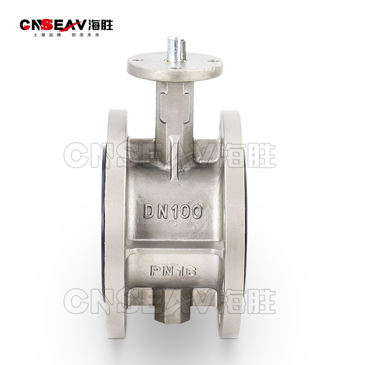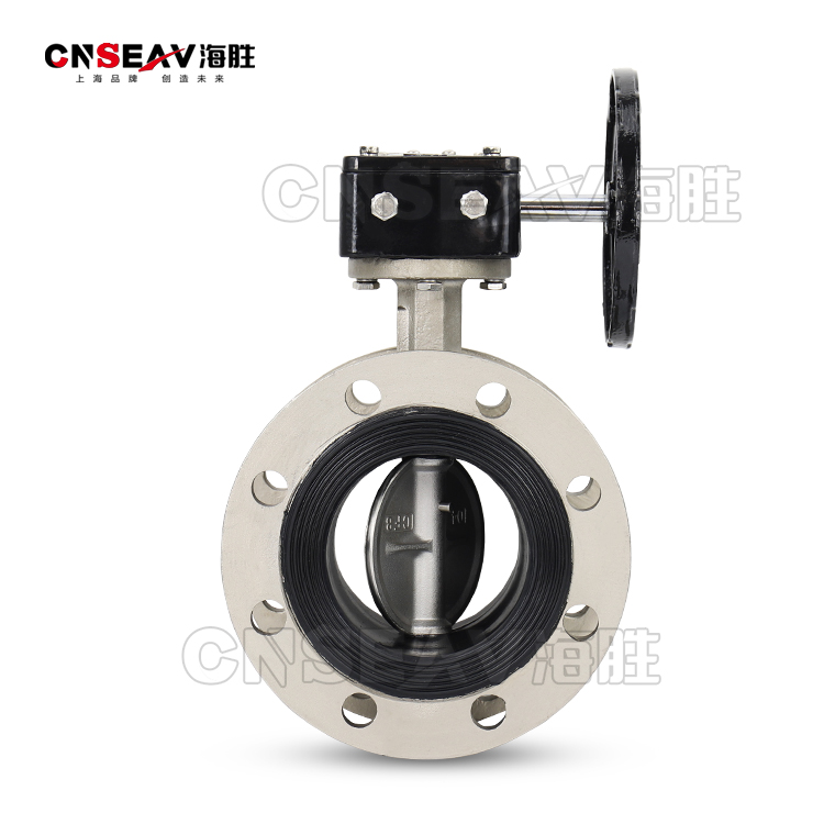 不锈钢涡轮法兰蝶阀D341X的蝶板回转中心(也就是阀杆的中心)位于阀体的中心线和蝶板的密封面截面上,蝶板旋转90角度完成启闭。