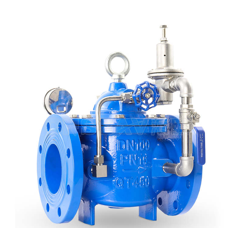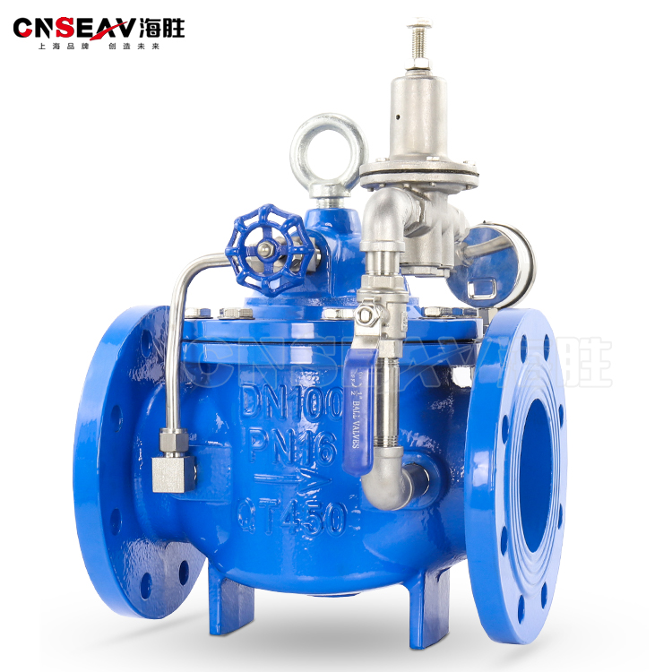 当阀门出口压力降到导阀弹簧设定压力时,导阀开启,控制室向下游排水。由于导阀系统排水量大于针阀的进水量,主阀控制室压力下降。进口压力使主阀开启。在稳定状态下,控制室进水、排水相同,主阀开度不变,出口压力稳定。调节导阀弹簧即可设定出口压力。