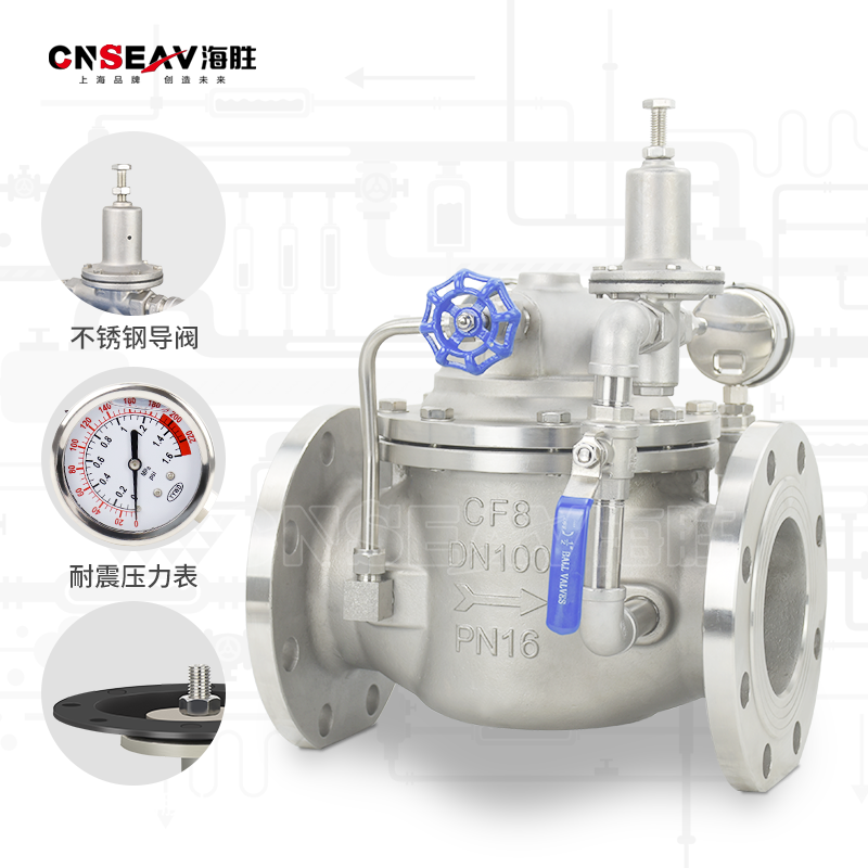 200X不锈钢减压阀由主阀、导阀、针阀、球阀、微型过滤器和压力表组成水力控制接管系统。使用时,当调定出口压力后,能自动保持稳定出口压力。