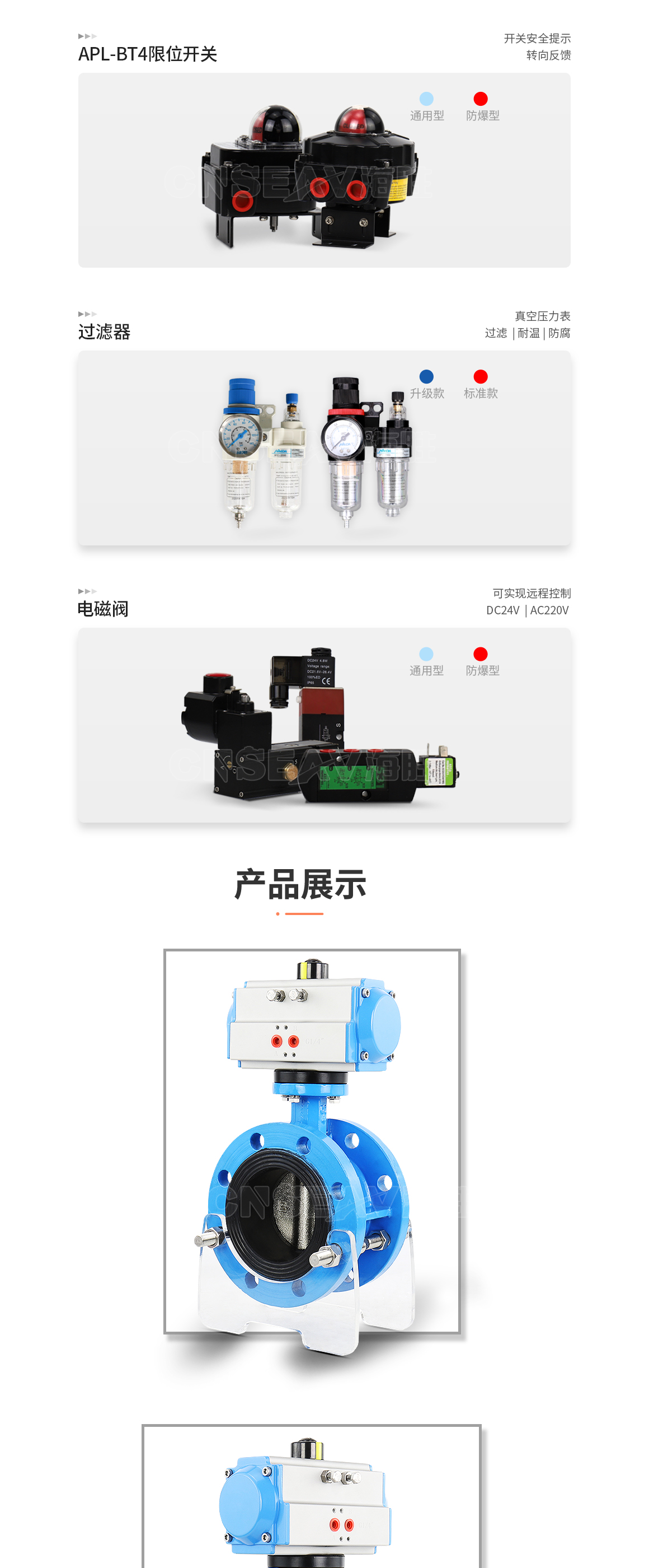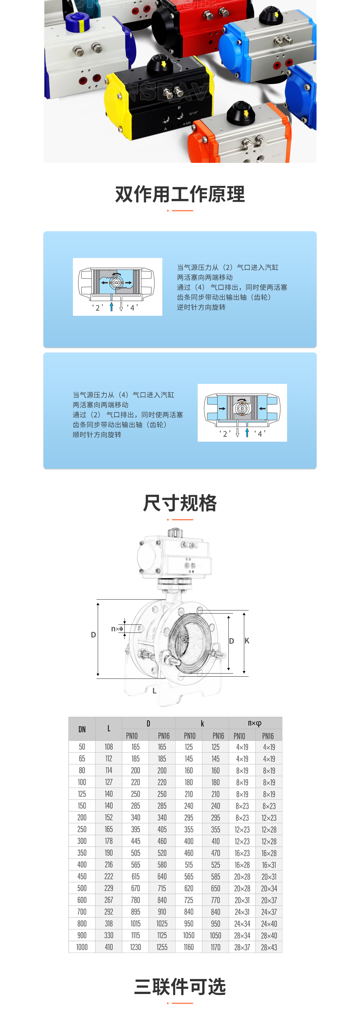 可配附件 | 定位器、电磁阀、空气过滤减压器、保位阀、行程开关、阀位传送器、手轮机构等 |