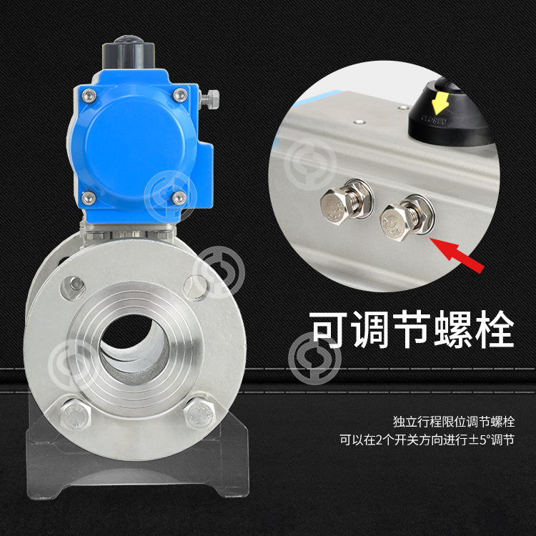 1.气动执行器顶部连动可视器,当绿色标志指向“开”字时代表阀门处于开启状态;