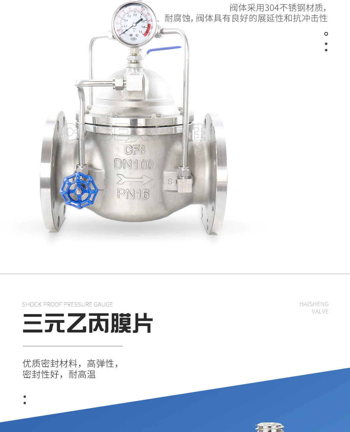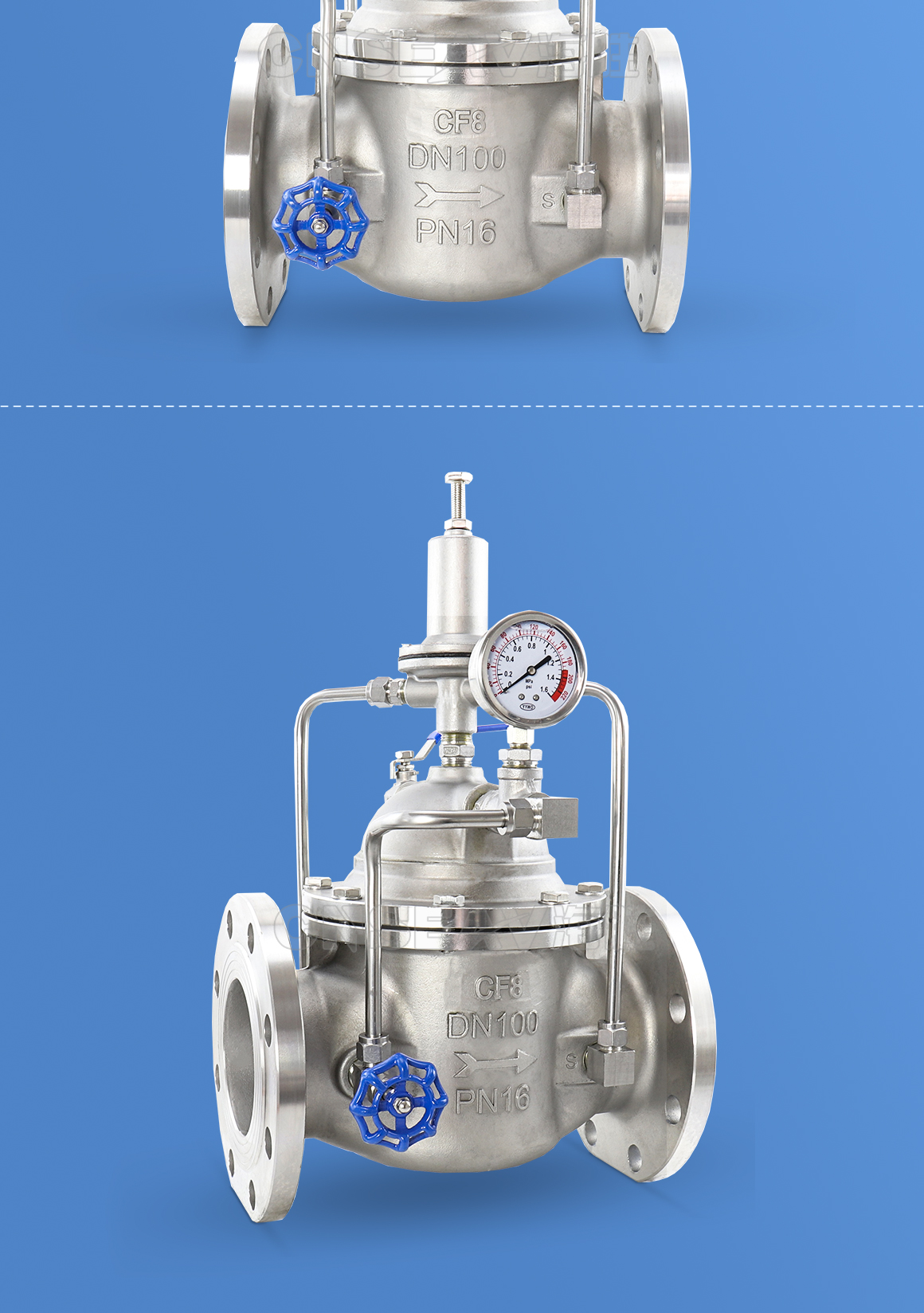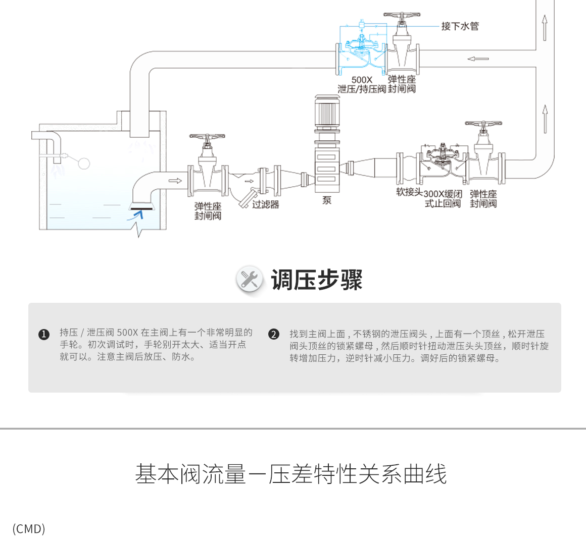 2、泄压主要安装于泄水旁路,可保证主阀上游于导阀设定值以下,防止管路高压或突然高压对管路及设备的损坏。