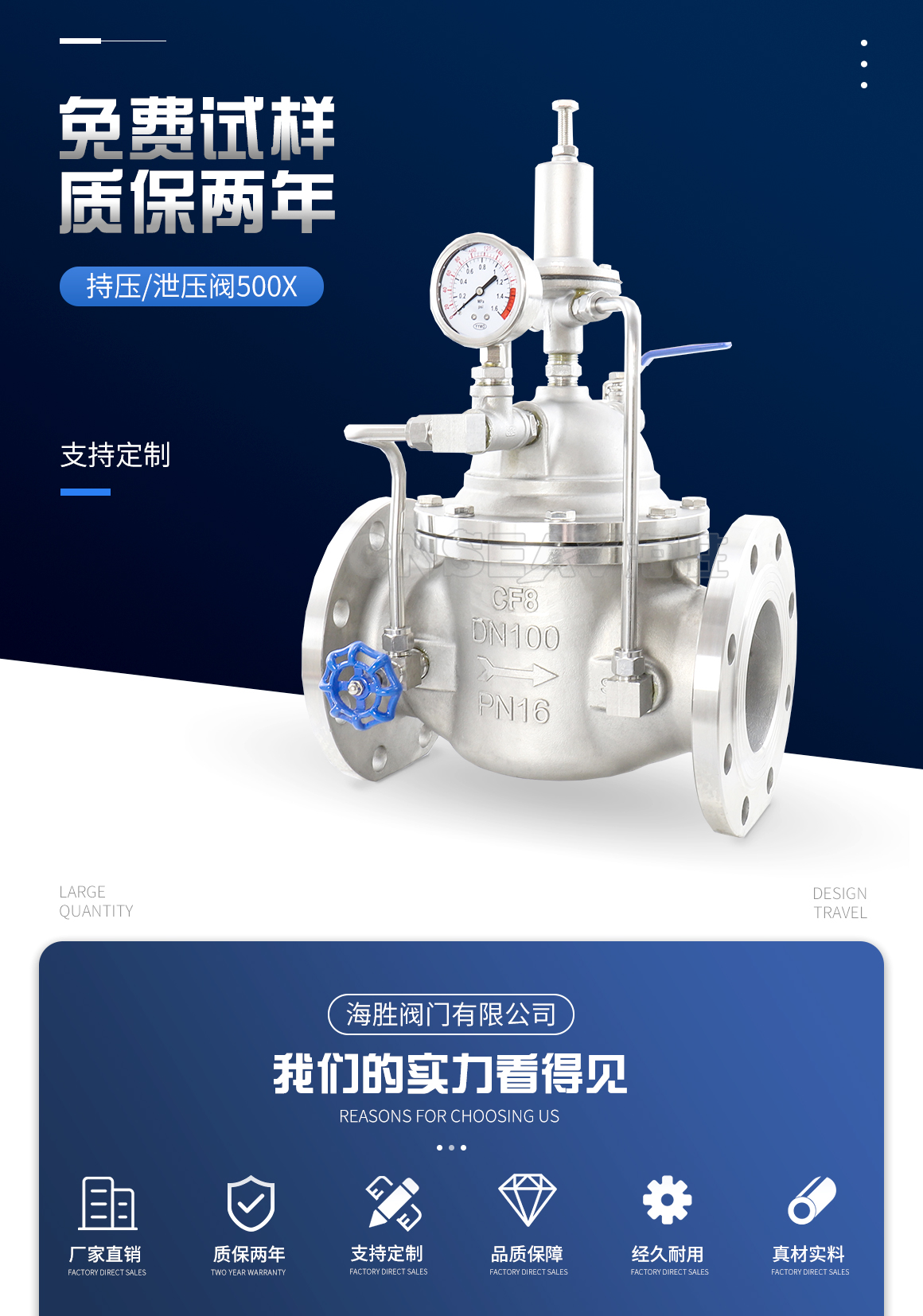 500X安全泄压阀产品用于高层建筑、生活区等供水管网系统及城市供水工程。500X安全泄压阀用于消防或其他供水系统中,以防止系统超压或维持消防供水系统的压力。消防泵关闭后还可以减小水锤的冲击。也用于大型供水系统的水锤消除装置.并且阀门控制系统的阀前处装有一个自清洁滤网,利用流体特性,使比重较大、直径较大的悬浮颗粒不会进入控制系统.符合系统循环,使阀门能正常地运行。系统动作平稳、强度高、使用寿命长、适用于600口径以下的管道。