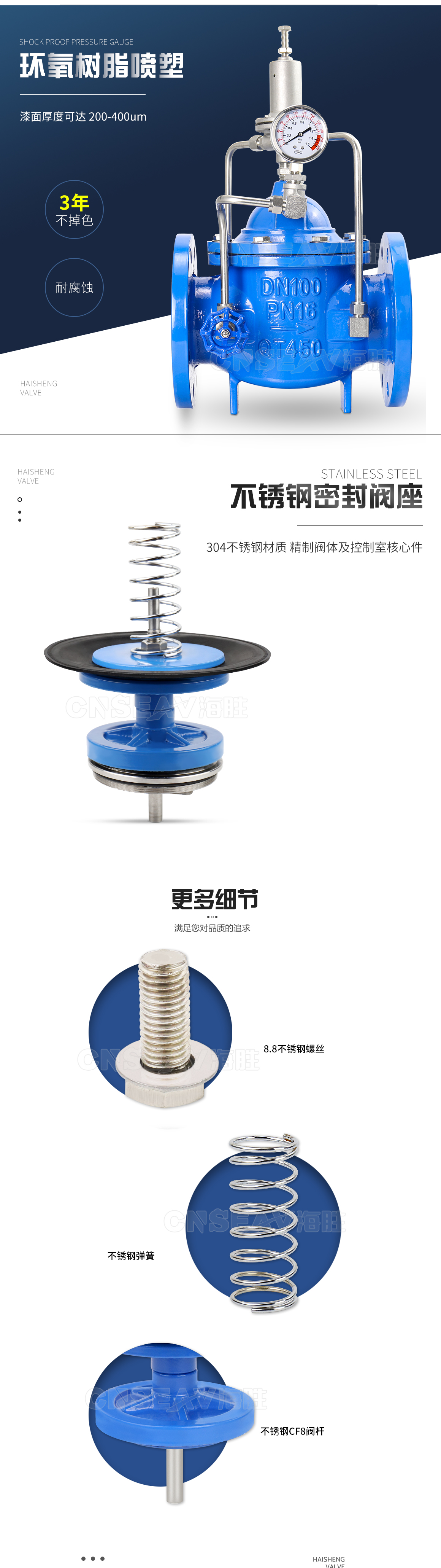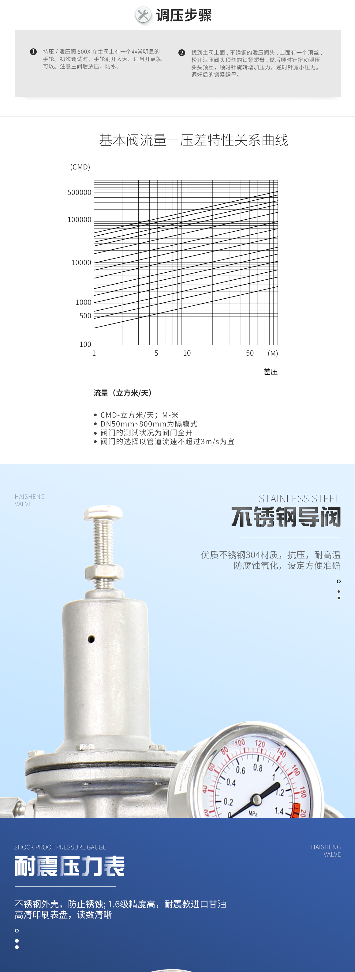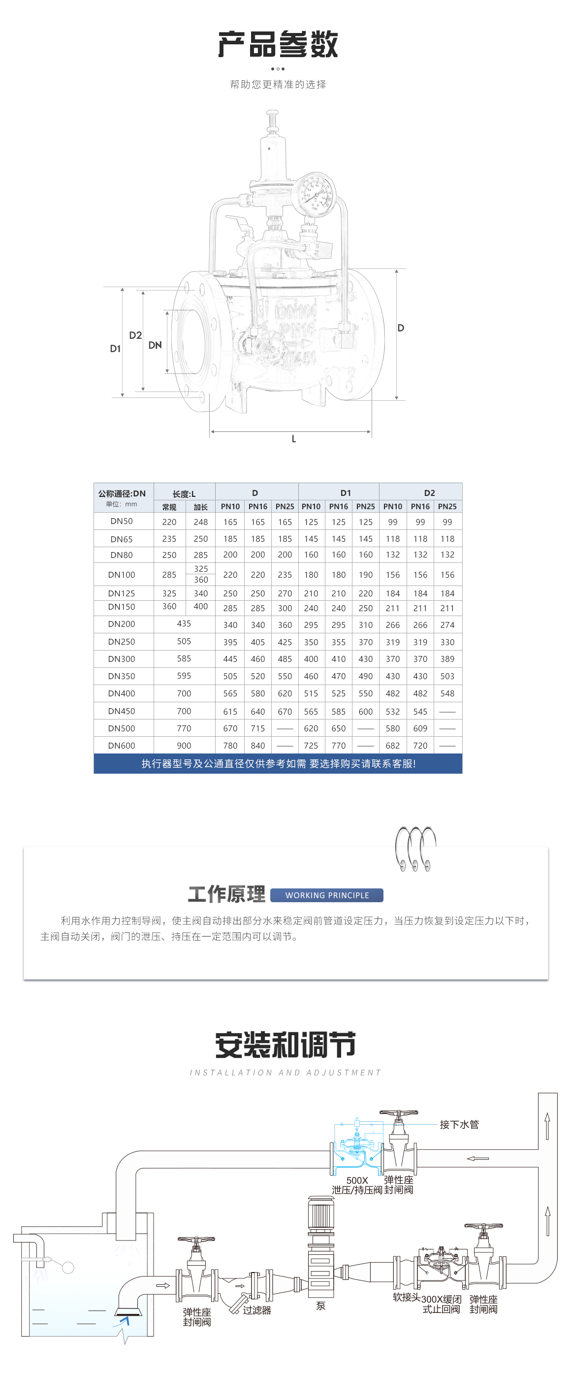 2、泄压主要安装于泄水旁路,可保证主阀上游于导阀设定值以下,防止管路高压或突然高压对管路及设备的损坏。
