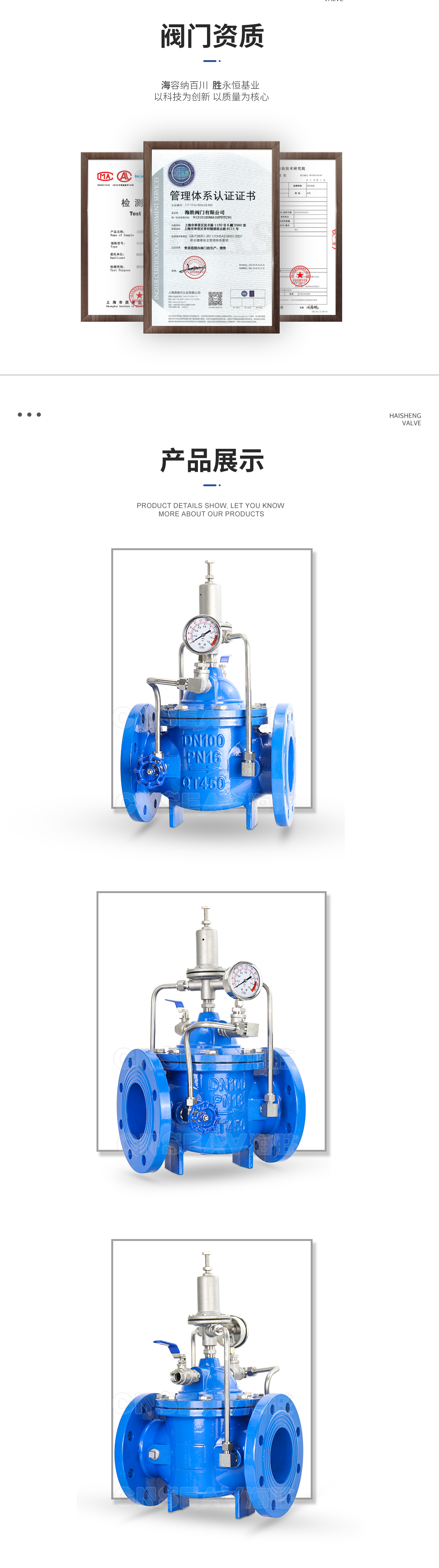 本系列500X持压泄压阀产品用于高层建筑、生活区等供水管网系统及城市供水工程。500X持压泄压阀用于消防或其他供水系统中,以防止系统超压或维持消防供水系统的压力。消防泵关闭后还可以减小水锤的冲击。也用于大型供水系统的水锤消除装置.并且阀门控制系统的阀前处装有一个自清洁滤网,利用流体特性,使比重较大、直径较大的悬浮颗粒不会进入控制系统.符合系统循环,使阀门能正常地运行。系统动作平稳、强度高、使用寿命长、适用于600口径以下的管道。