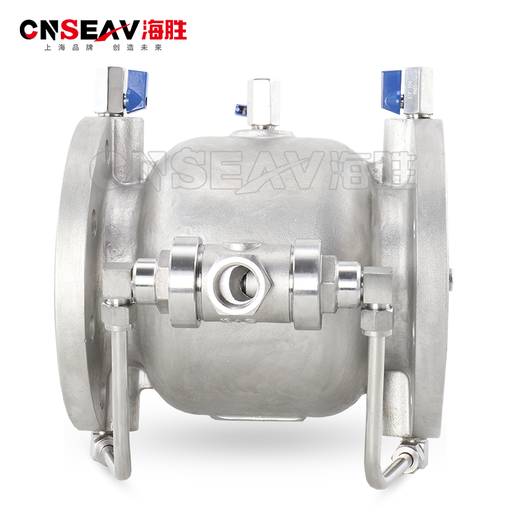 2、空气隔断、自动排水:主阀关闭时,排水器自动开启、中间腔泄压为零,主阀的上下游之间实现空气隔断或零压隔断,隔断性能安全可靠。