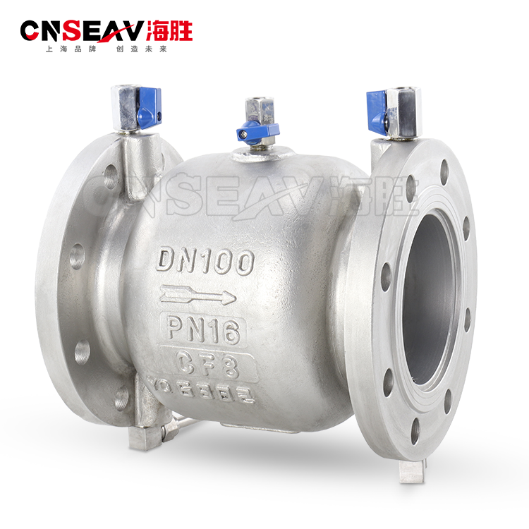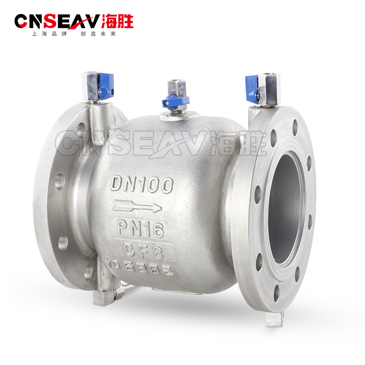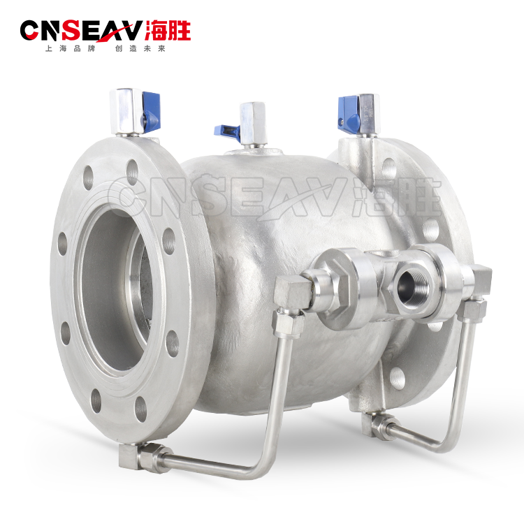 ●防止回流污染:进口压力小于出口压力时,两个止回阀瓣处于关闭状态,排水器处于开启状态如果其中一个或两个止回阀瓣的阀口有垃圾卡阻,产生渗漏,所漏介质均流向中间腔,经过排水器直接排出阀外,防止对进口端的回流污染。